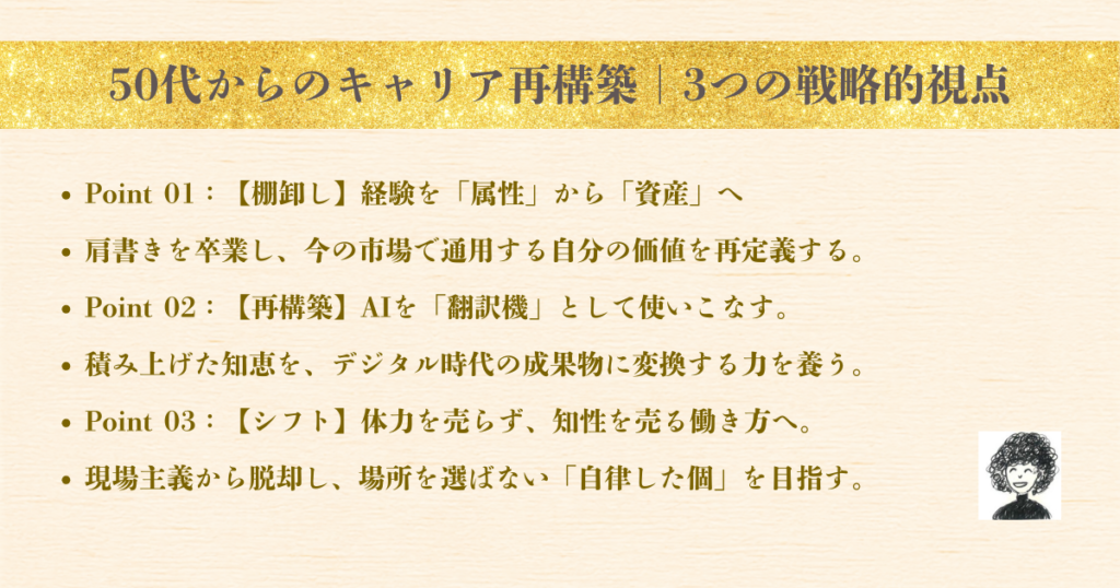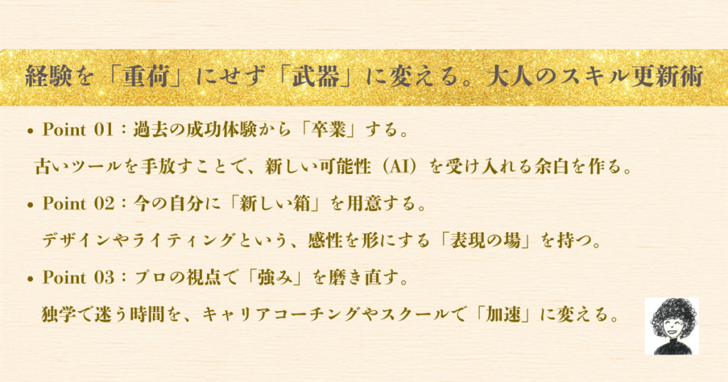 かつて必死に覚えたスキルも、今ではAIが一瞬でこなしてしまう時代です。 また、やりがいはあっても、体力的に今のまま走り続けることに限界を感じている方も多いはず。